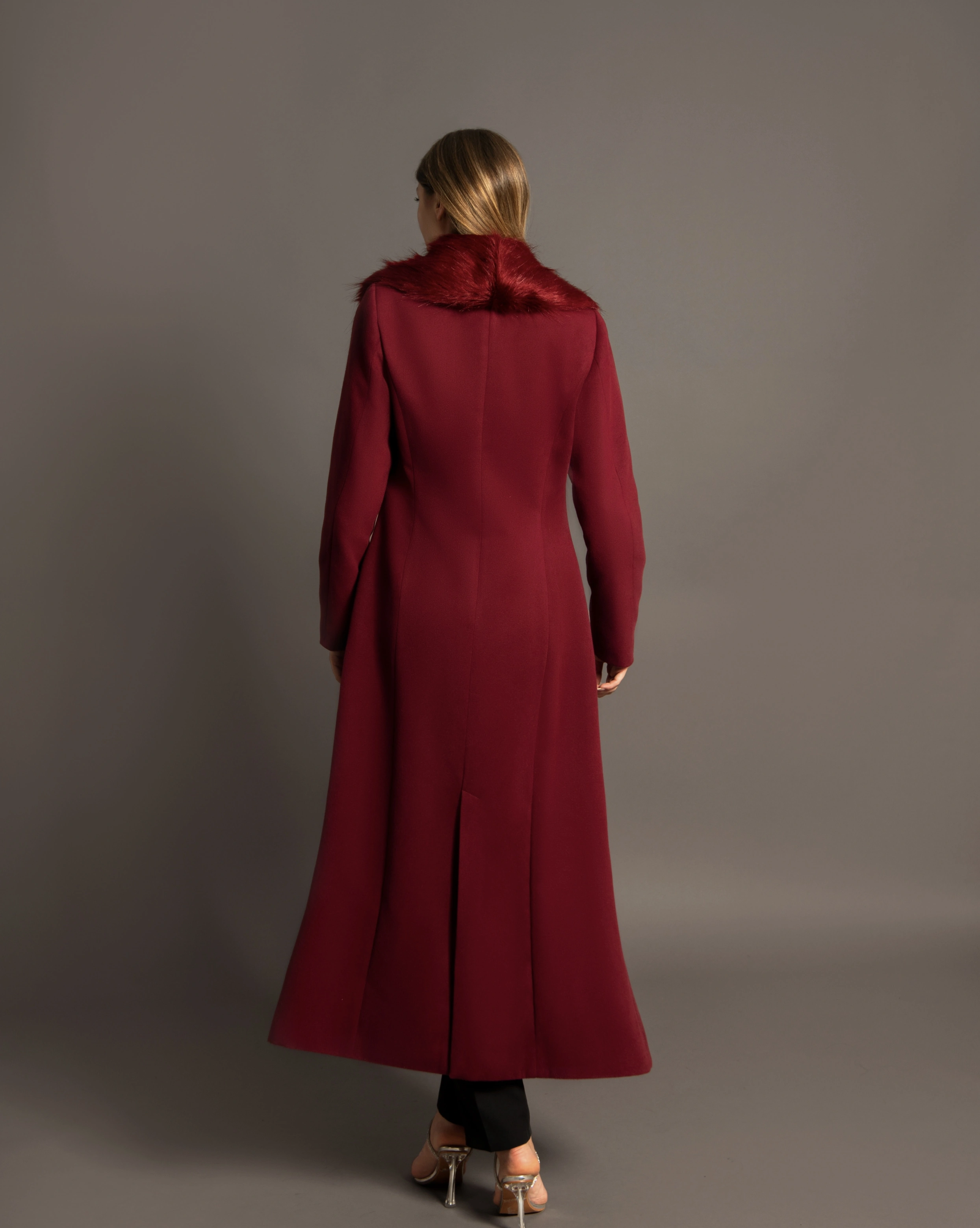 Палтото има стилен дизайн с добре очертани линии, подчертано от два предни копчета, които акцентират талията и придават женствен силует. Яката от пух добавя допълнителен слой топлина и изисканост. Цветът и дизайнът правят това палто идеално за официални поводи или елегантни зимни събития.