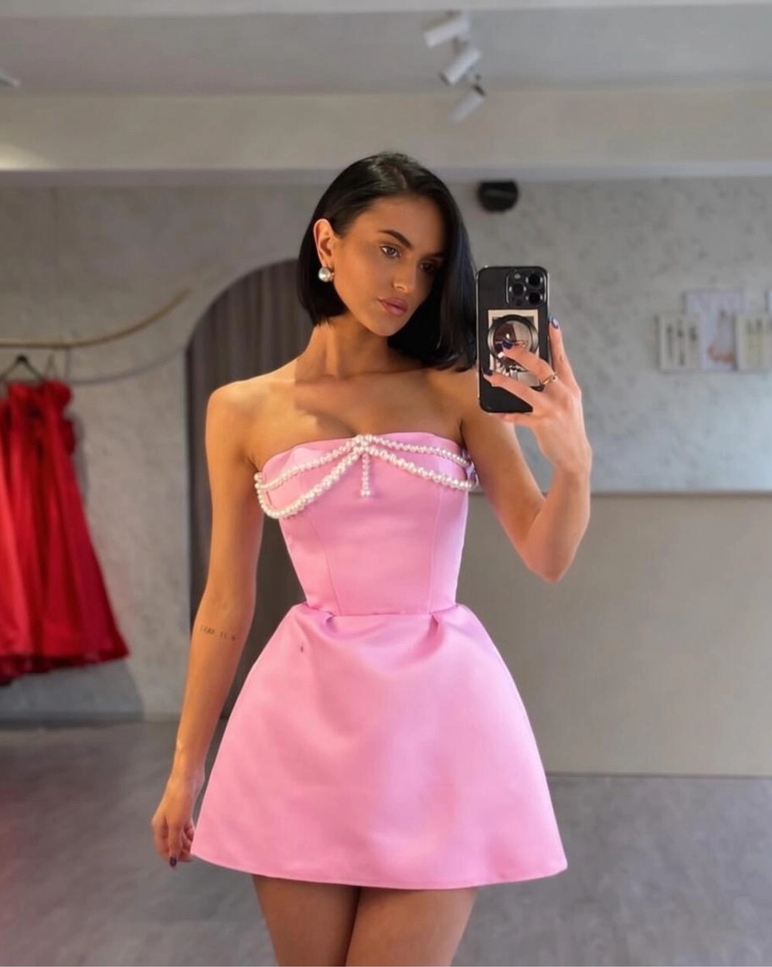 MERRA е къса рокля с романтично излъчване и изискани детайли, създадена за деликатни, но запомнящи се появи. Дизайнът тип корсет без презрамки подчертава линията на раменете и оформя талията по елегантен начин. Бюстът е декориран с фини апликации тип перли, които придават допълнителна изисканост и деликатен блясък. Дългите, обемни и подвижни ръкави създават драматичен ефект и позволяват визията да бъде трансформирана в по-минималистичен вариант.